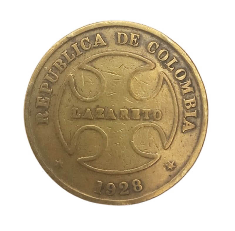 Colombia, pionera en acuñar monedas para lazaretos, fue el primer país en emitir monedas oficiales para su uso en tres leproserías: Agua de Dios, Caño de Loro y Contratación. En total, se realizaron cuatro emisiones entre 1901 y 1928. La primera, en 1901 (Figura 1), incluyó cinco valores en cobre: 2 1/2, 5, 10, 20 y 50 centavos de peso. La emisión de 1907 contó con monedas de 1, 5 y 10 pesos, mientras que en 1921 se acuñaron monedas en cobre de 1, 2, 5, 10 y 50 centavos. La última emisión, en 1928, se realizó en níquel y solo incluyó monedas de 50 centavos. Todas las monedas llevan el diseño de una cruz con la inscripción "lazareto", el valor, año, la leyenda "República de Colombia" y algunas incluyen el escudo nacional y lugar de fabricación. Aunque la mayoría de las piezas son comunes, la de 2 1/2 centavos de 1901 es considerada muy rara.
