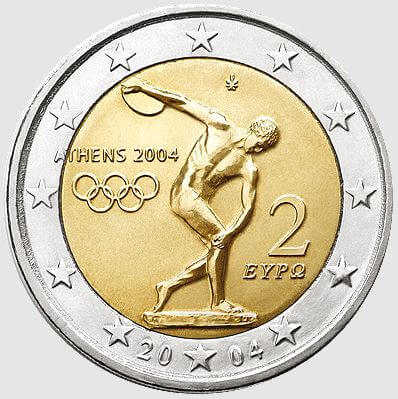 La Moneda Conmemorativa de 2 Euros de Grecia 2004 - Juegos Olímpicos de Atenas 2004 tiene dos variantes, sin moneda tipo. El 50% de los cantos de esta moneda muestran al discóbolo y el otro 50% al mapa de Europa. Ambas versiones fueron acuñadas al mismo tiempo.